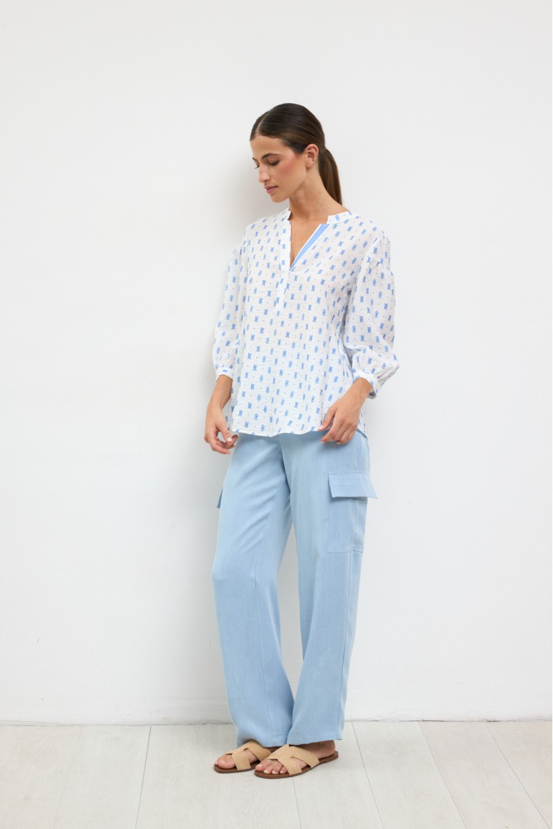 Blusa de manga tres cuartos abullonada , cuello mao detalles de estampado geométrico sobre fondo liso y vivo a contraste en el escote en forma de V y bajo recto.